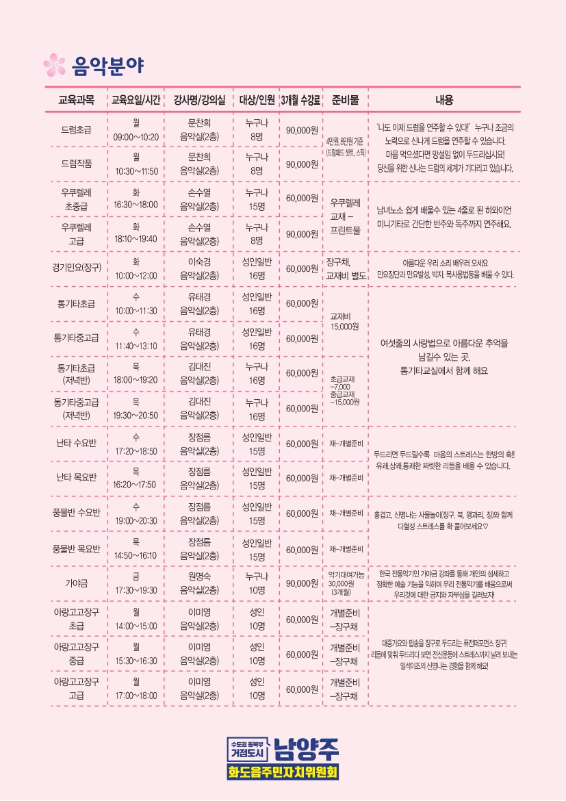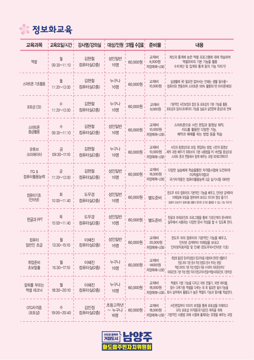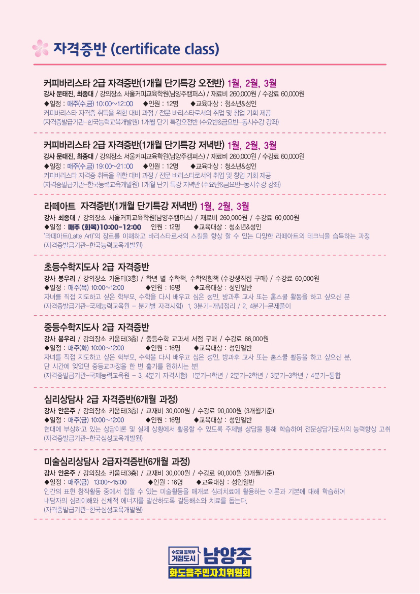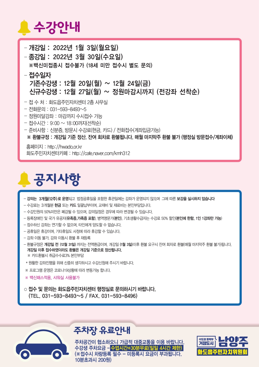 ➩준비사항 : 신분증, 백신접종완료증명서, 방문시 수강료(현금, 카드) / 전화접수(계좌입금가능)