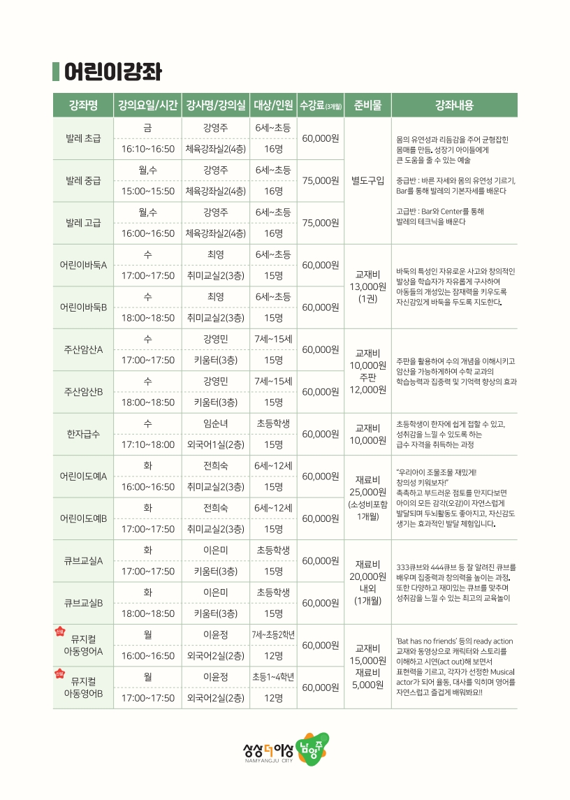 신규수강생 : 3월 17일(월) ~ 정원마감시까지 (전강좌 선착순)