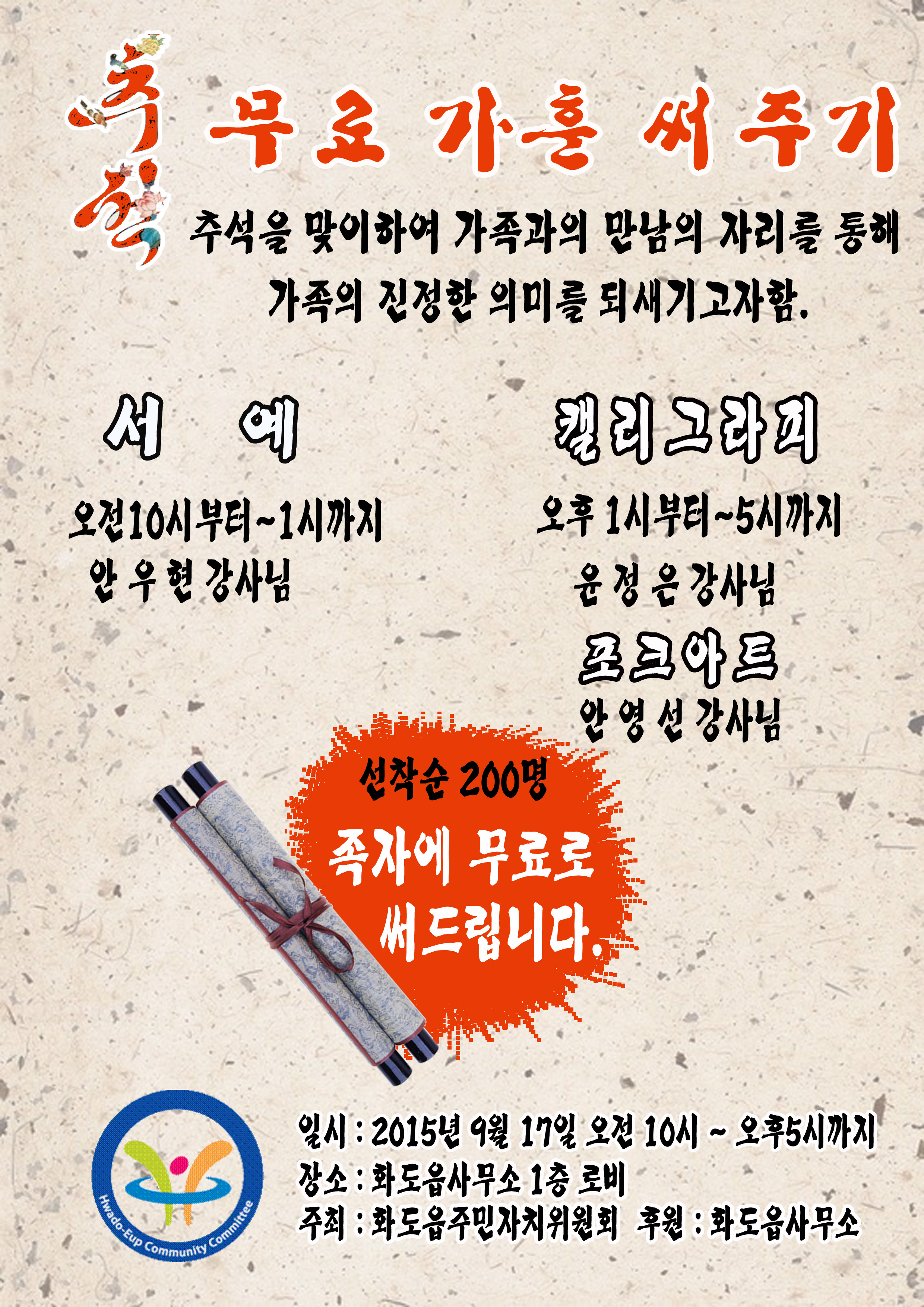 화도주민자치센터 추석맞이 무료가훈써주기 행사 (200명 선착순 - 족자에 써드려요^^)