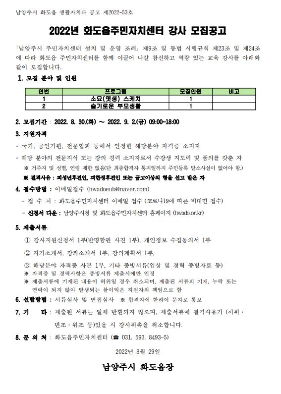 남양주시 화도읍 생활자치과 공고 제2022-53호 2022년 화도읍주민자치센터 강사 모집공고「남양주시 주민자치센터 설치 및 운영 조례」 제9조 및 동법 시행규칙 제23조 및 제24조에 따라 화도읍 주민자치센터를 함께 이끌어 나갈 참신하고 역량 있는 교육 강사를 붙임 문서와 같이 모집합니다.