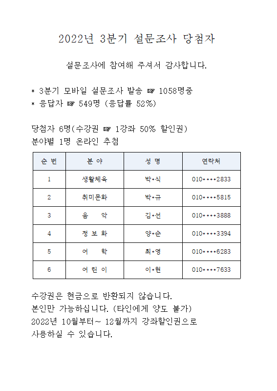 2022년 8월 29일 부터 9월 2일까지 모바일 설문조사 실시 프로그램 수강생 전체 문자발송 설문조사를 응답해주신분에게는 추첨을 통하여 분야별(6개분야) 1명 온라인 추첨 50% 할인 수강권 지급 (당첨인원 : 6명) (발표일 : 2022년 9월 16일) ★ 당첨자 개별 문자 발송
