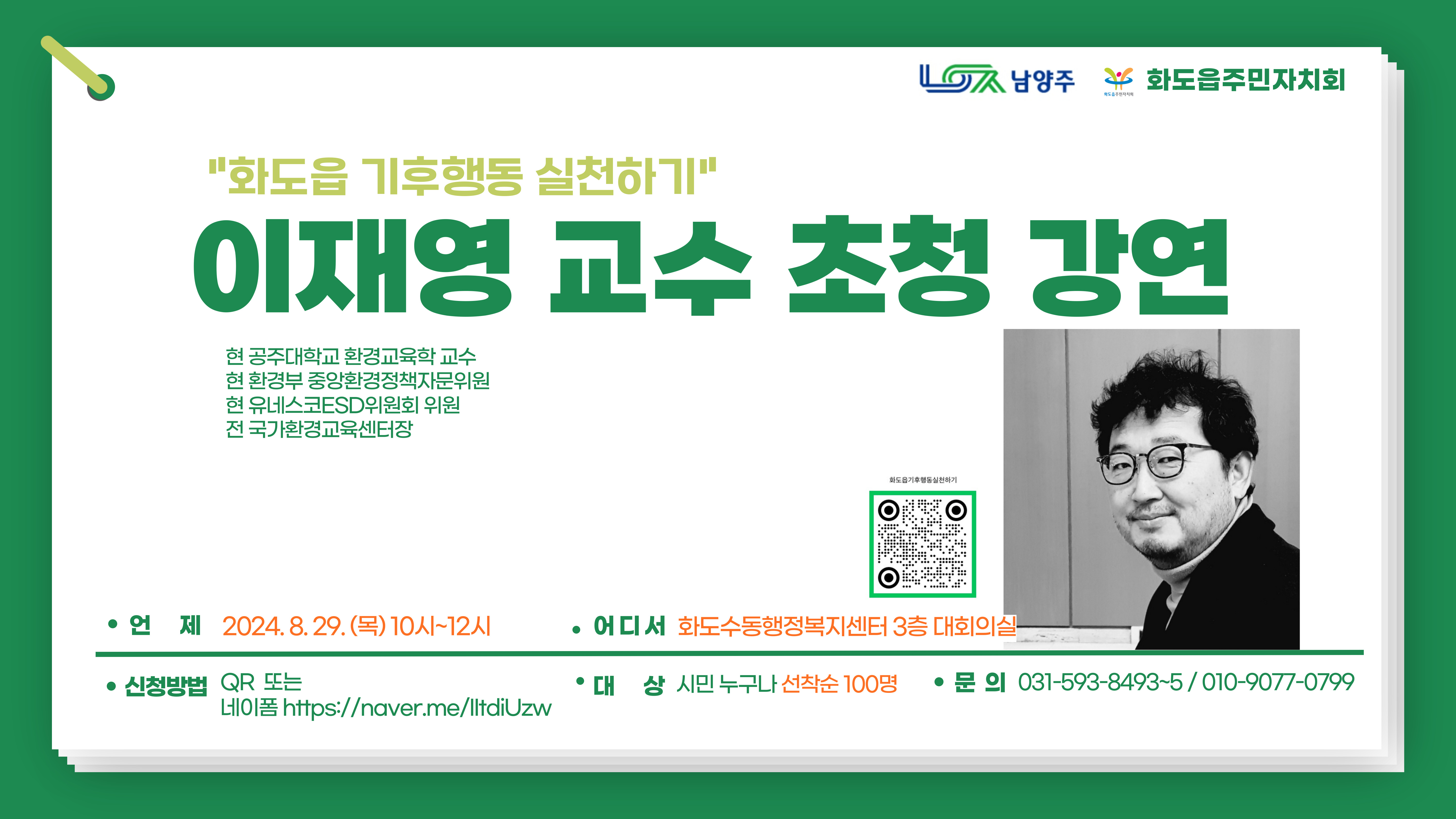 남양주시 화도읍주민자치회(회장 최영균)는 오는 29일 오전10시 화도수동행정복지센터 대회의실에서 이재영 공주대학교 환경교육학과 교수를 초청해 ‘국가 환경정책 방향과 책임(기회) 세대의 역할’을 주제로 특강을 개최한다.