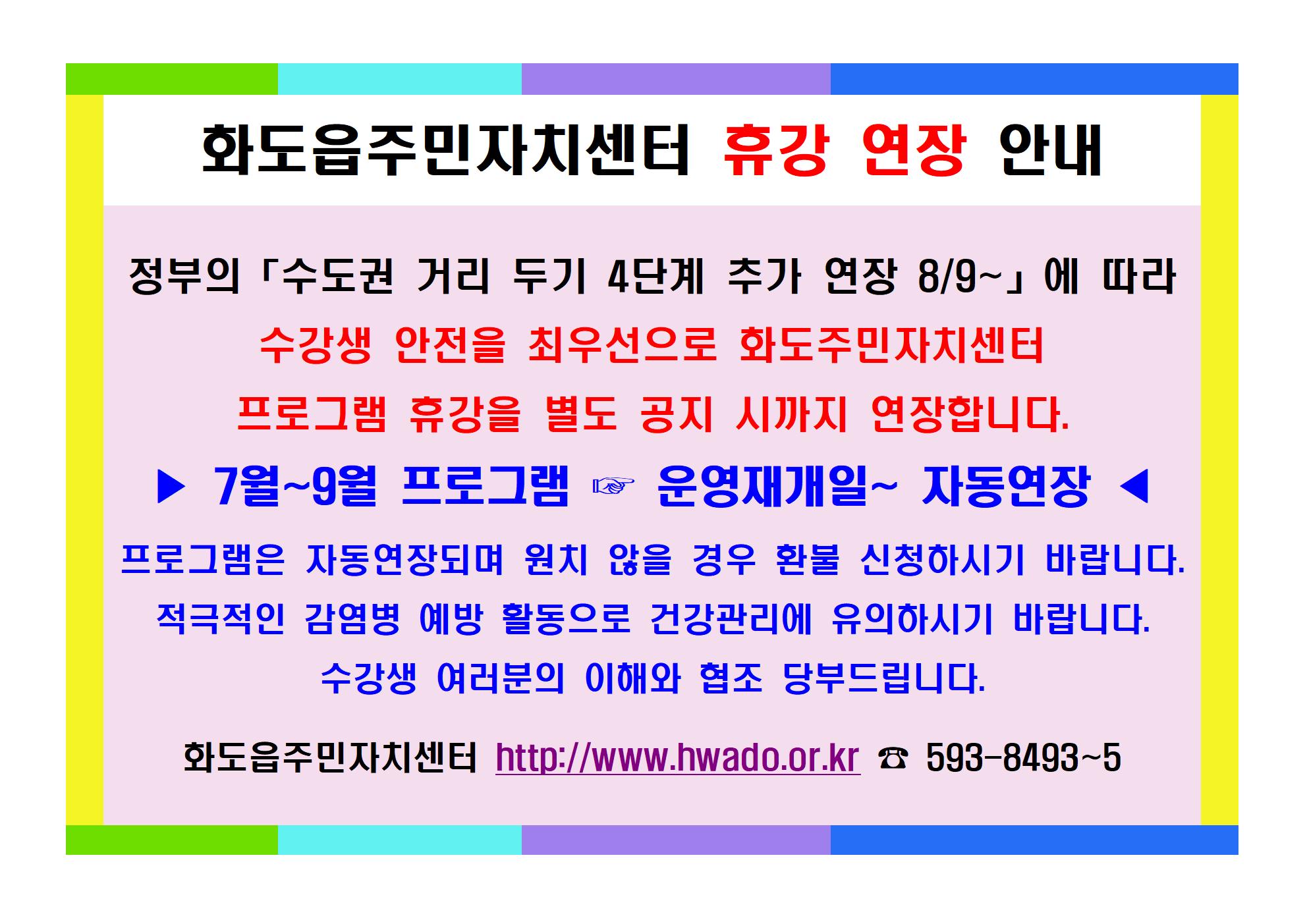 ※ 화도주민자치센터 휴강 연장 알림 (8/9~ 별도 공지시까지)