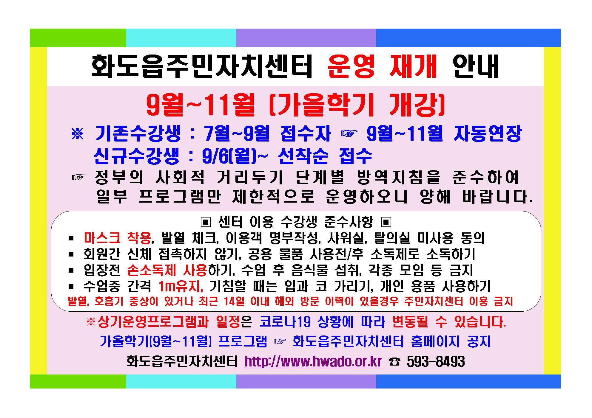 화도주민자치센터 가을학기(9월~11월)운영 재개 알림