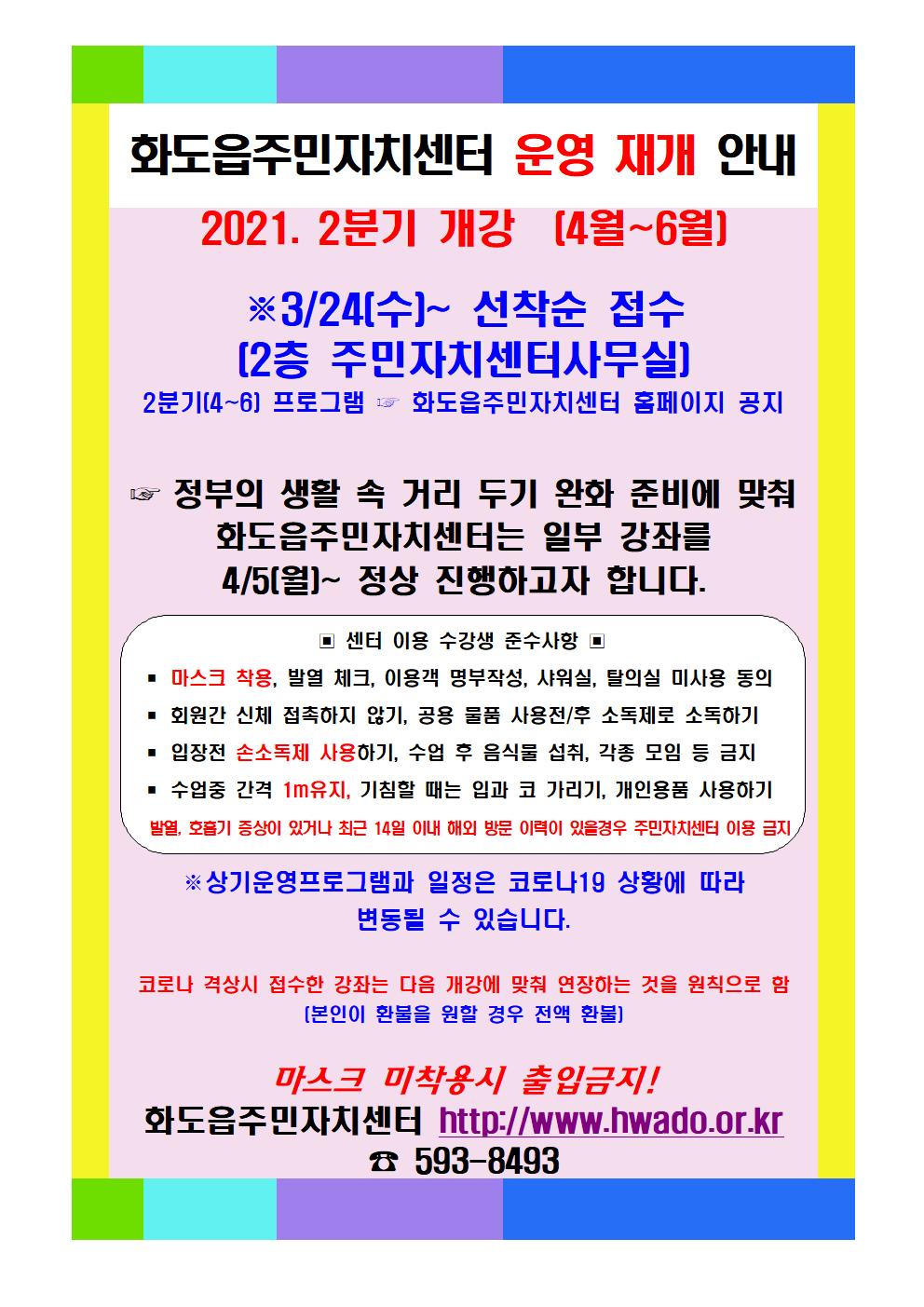 ※격렬한 운동(에어로빅,사교댄스등) 및 비말 발생(노래관련) 강좌 제한 지침에 따라 일부강좌만 정상진행 예정입니다. 양해바랍니다. (코로나19상황에 따라 변동가능) 접수는 프로그램안내 게시판 참고하시기 바랍니다. ※ 코로나 현단계에서 격상될 경우 자치센터 대면 강좌는 운영 불가 온오프라인 병행 강좌는 비대면으로 진행 가능 합니다~ 참고하시고 접수해주시기 바랍니다. 기타 자세한 문의는 031 593-8493~5으로 문의해 주시기 바랍니다.