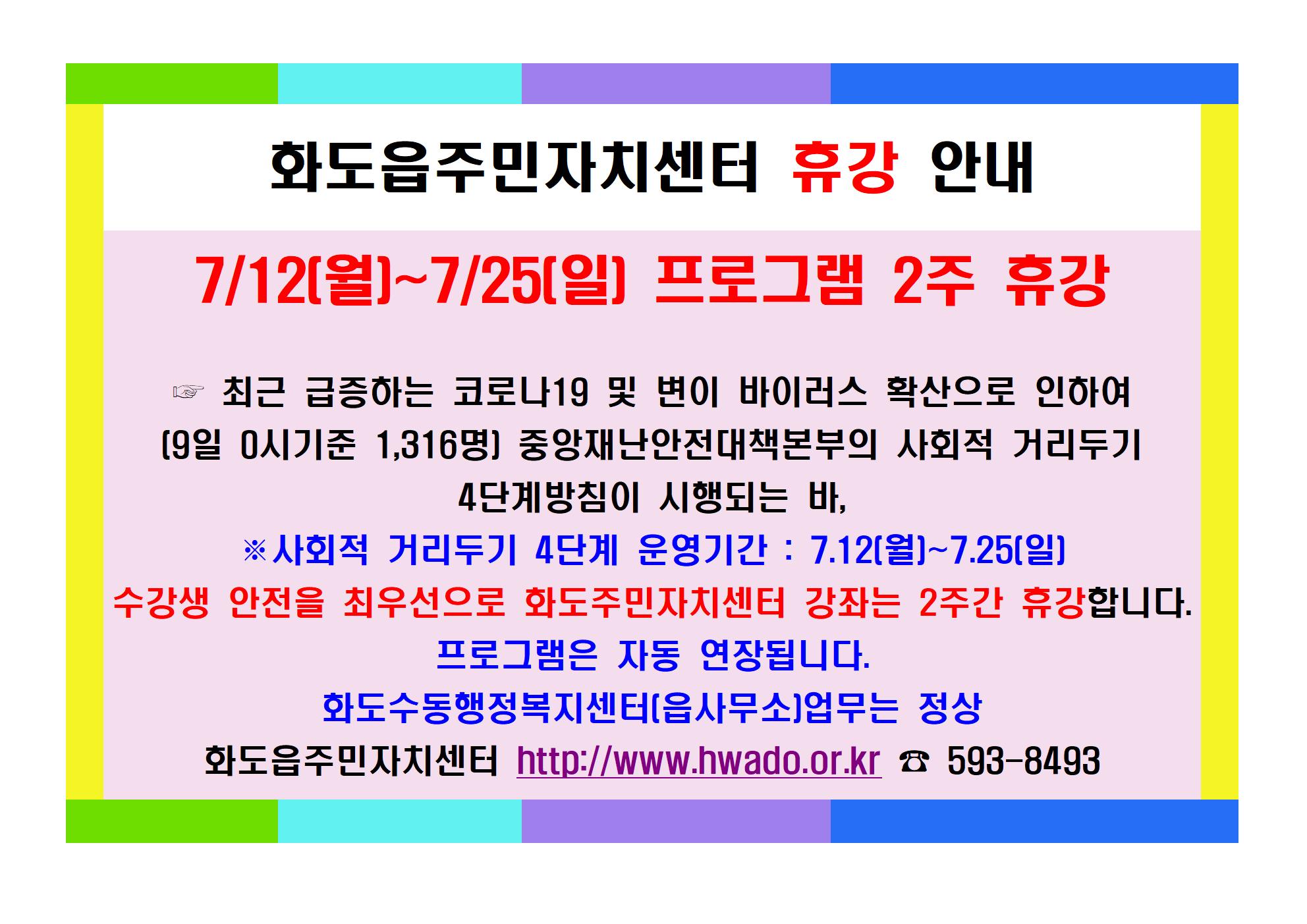 ※ 화도주민자치센터 휴강 알림