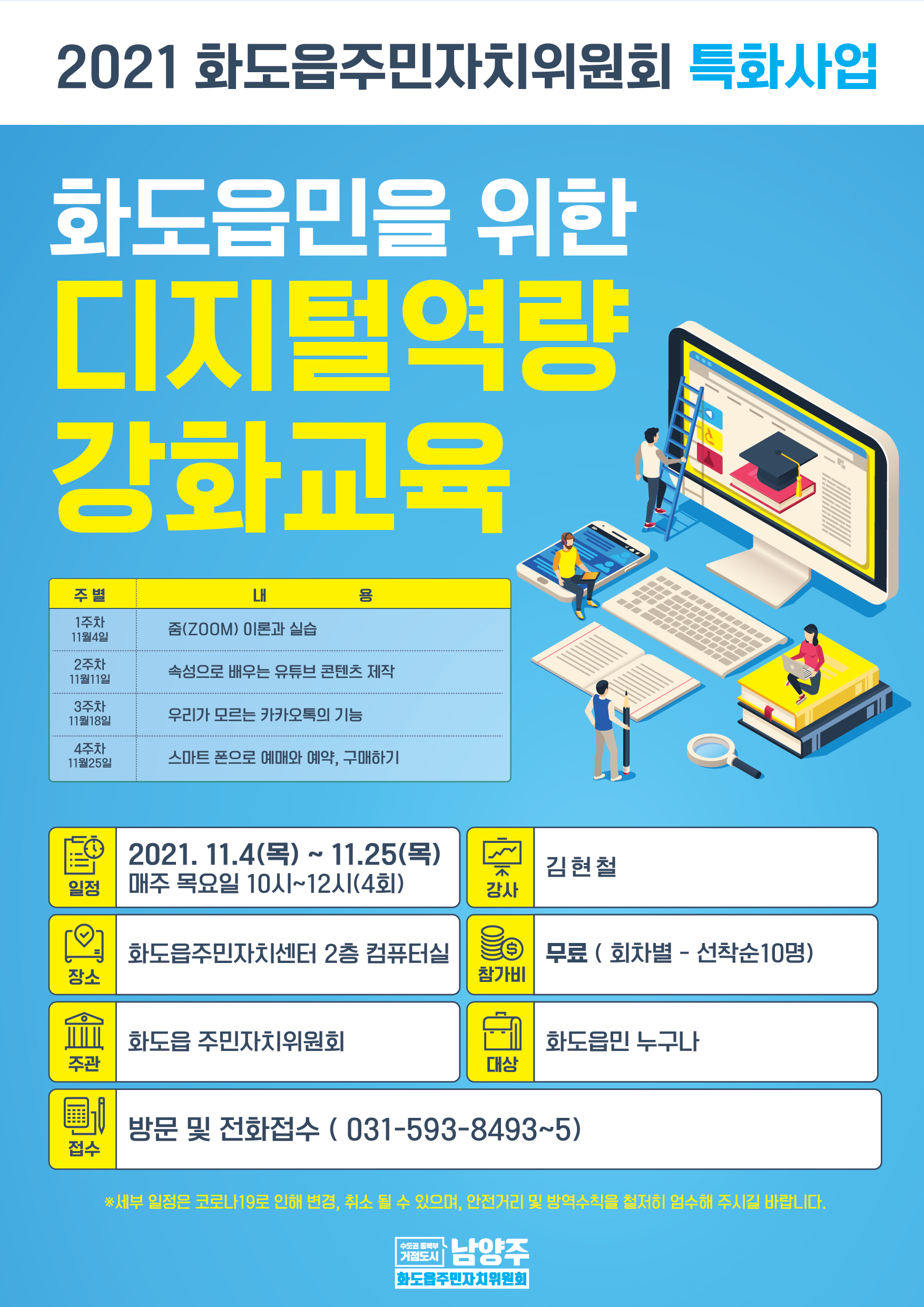 ♣ 스마트폰부터 유튜브 제작까지 제대로 배우고 익히면 인생이 즐거워 집니다~ ♣ 방문 및 ☎접수 031 593 8493~5 (이름 생년월일 주소 연락처 - 접수시 필요한 개인 정보제공 동의) ♣ 교육비 및 재료비 - 전액 무료 ※ 회차별 선착순 10명 접수 조기마감이 예상되오니 서두르시기 바랍니다!. (회차별 접수 / 전회차 접수 모두 가능)