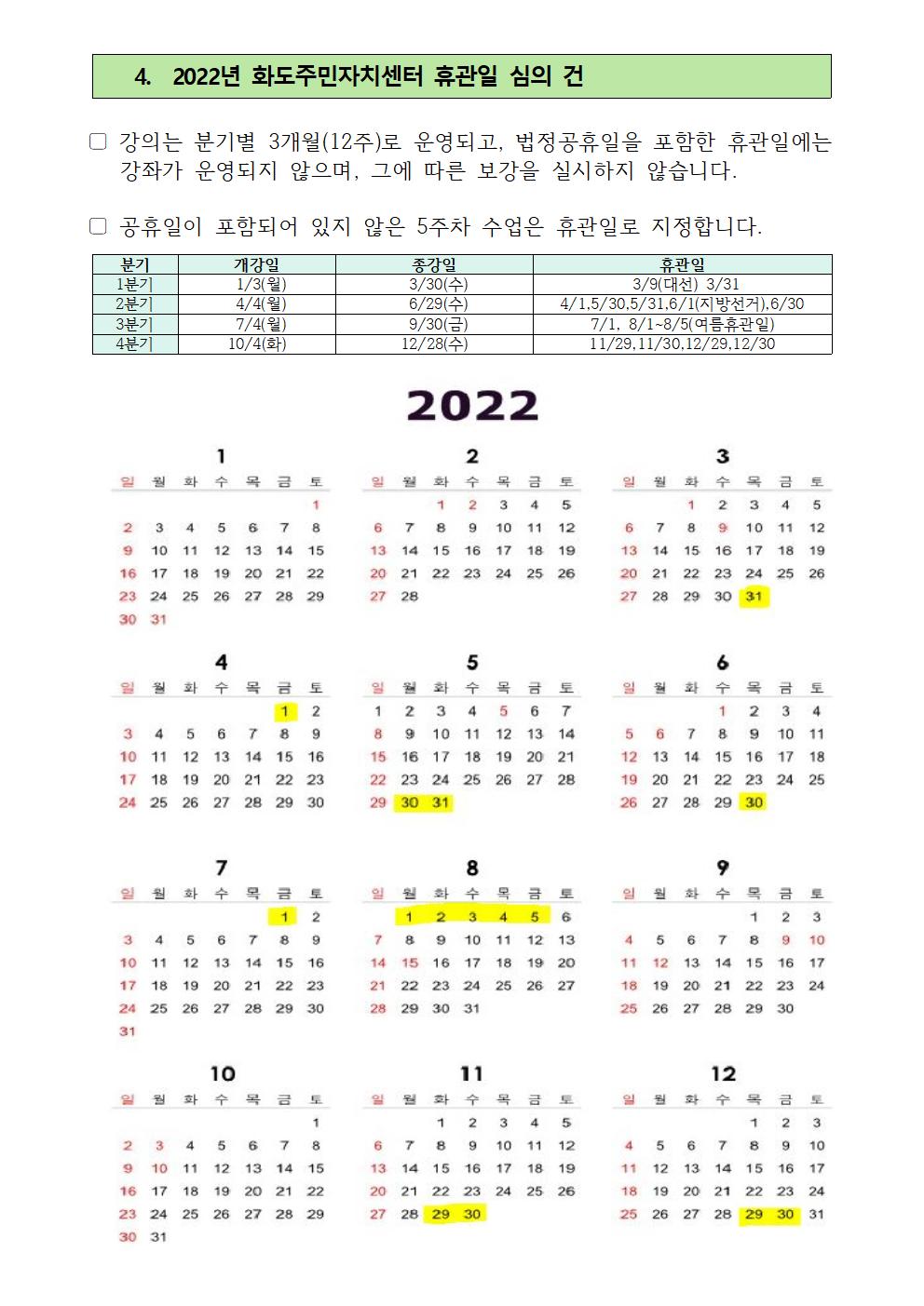 화도주민자치센터 2022년 휴관일 심의 공지!