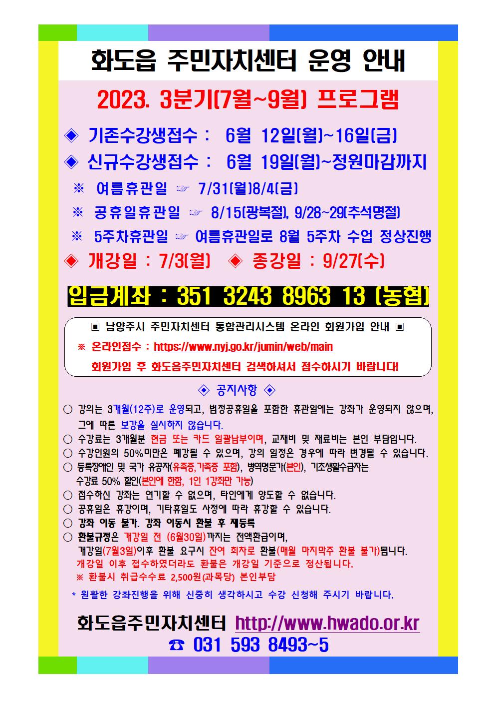 2023년 3분기(7월~9월) 화도주민자치센터 프로그램 수강생모집안내