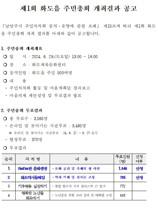 「남양주시 주민자치회 설치·운영에 관한 조례」 제15조에 따라 제1회 화도읍 주민총회 개최 결과를 공고합니다.