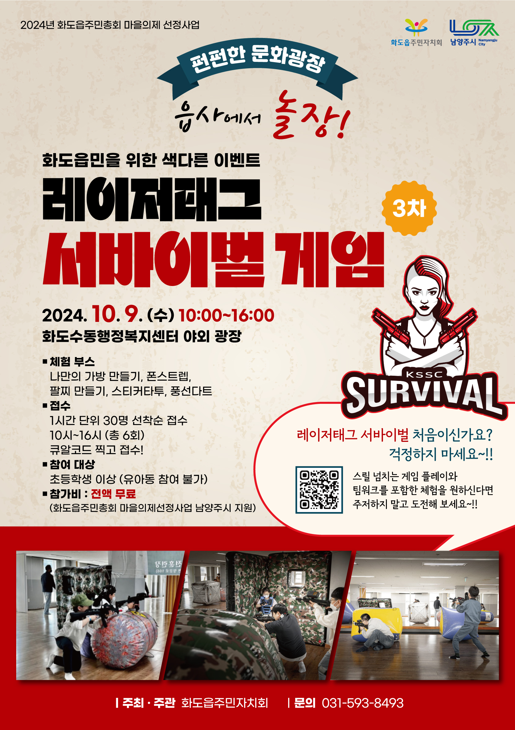 펀펀한 문화광장 "읍사에서 놀장" 3차 "화도읍민을위한 이색이벤트 레이저태그서바이벌게임" 개최! 10/9(수)오전10시~ 야외광장(전액무료) QR코드찍고 사전접수!